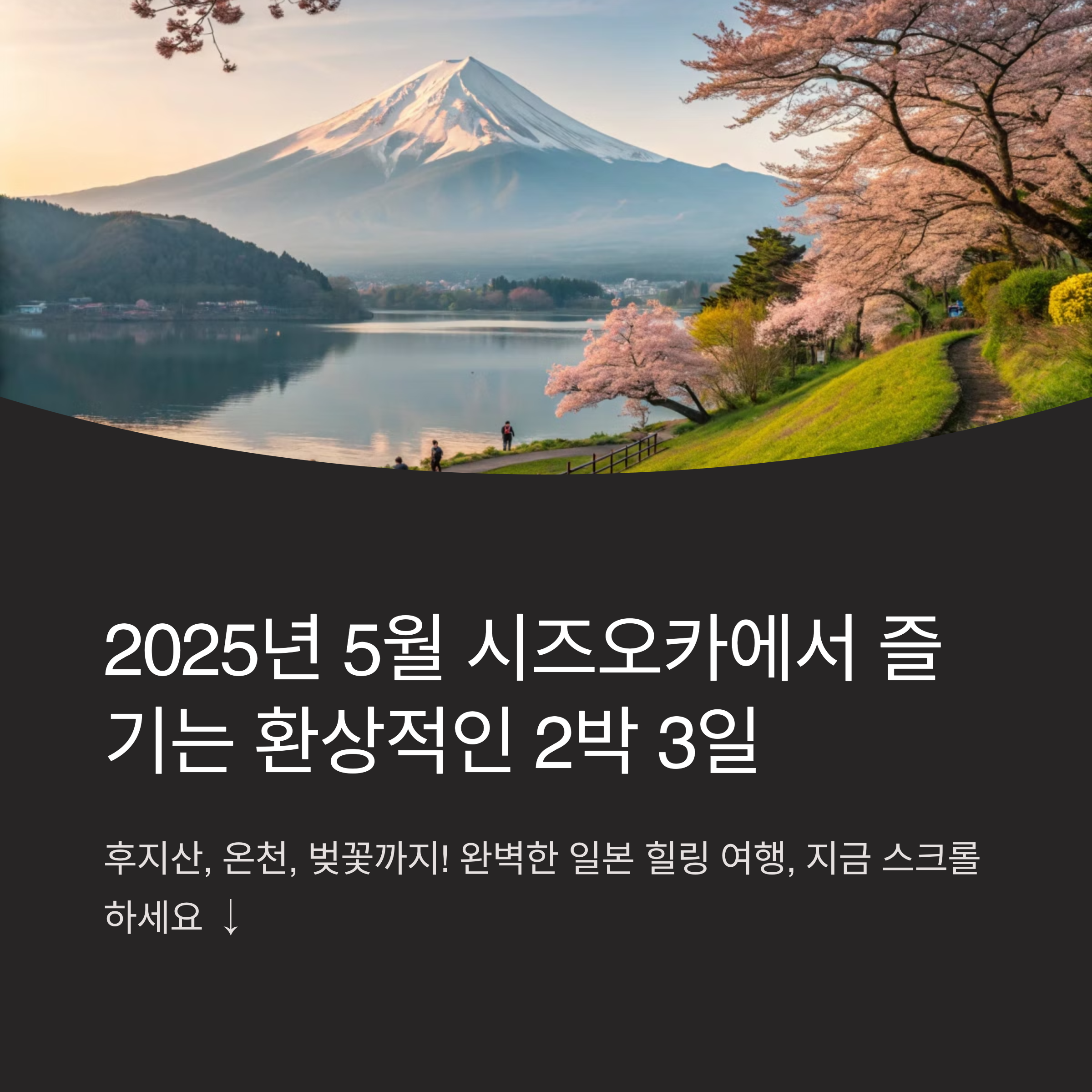 안녕하세요! 2025년 5월에 일본 시즈오카로 2박 3일 여행을 계획하고 계시다니 정말 멋진 선택이에요. 시즈오카는 후지산의 장엄한 풍경과 벚꽃, 온천, 그리고 녹차까지 즐길 수 있는 매력적인 곳으로, 특히 5월은 날씨가 따뜻하면서도 너무 덥지 않아 여행하기에 딱 좋아요. 게다가 5월이면 늦벚꽃을 볼 기회도 남아 있을 수 있고, 꽃가루 알레르기 걱정도 봄 초반보다는 덜한 시기라 부담 없이 자연을 만끽할 수 있답니다.