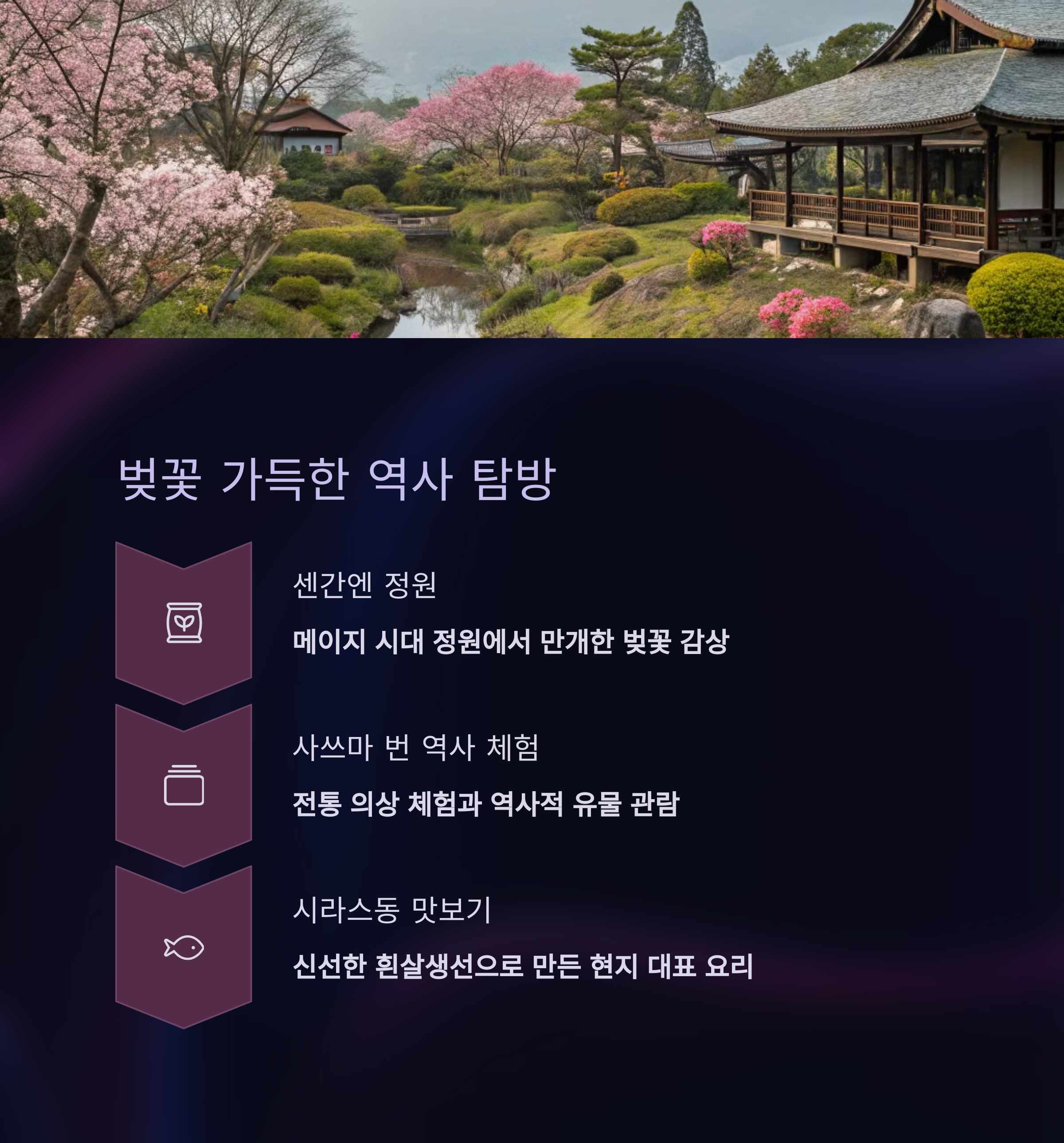 - 시로야마 공원: 가고시마 시내를 내려다보는 언덕으로, 벚꽃 터널이 형성돼요. 밤에 야경과 함께 감상하면 더 로맨틱하답니다.